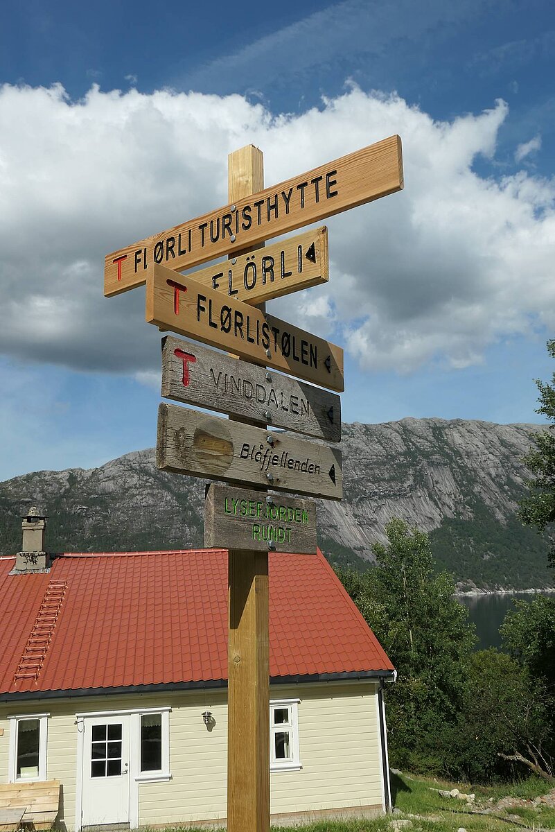 Die Flørlitreppe hat 4444 Stufen und ist einer der längsten Holztreppen der Welt. Die Treppe folgt den Schleusen, die das Wasserwerk am Ufer versorgten. Sie endet am Terneyass Damm. Weit über den Baumspitzen haben Sie eine fantastische Aussicht auf den Lysefjord und in Richtung Preikestolen.