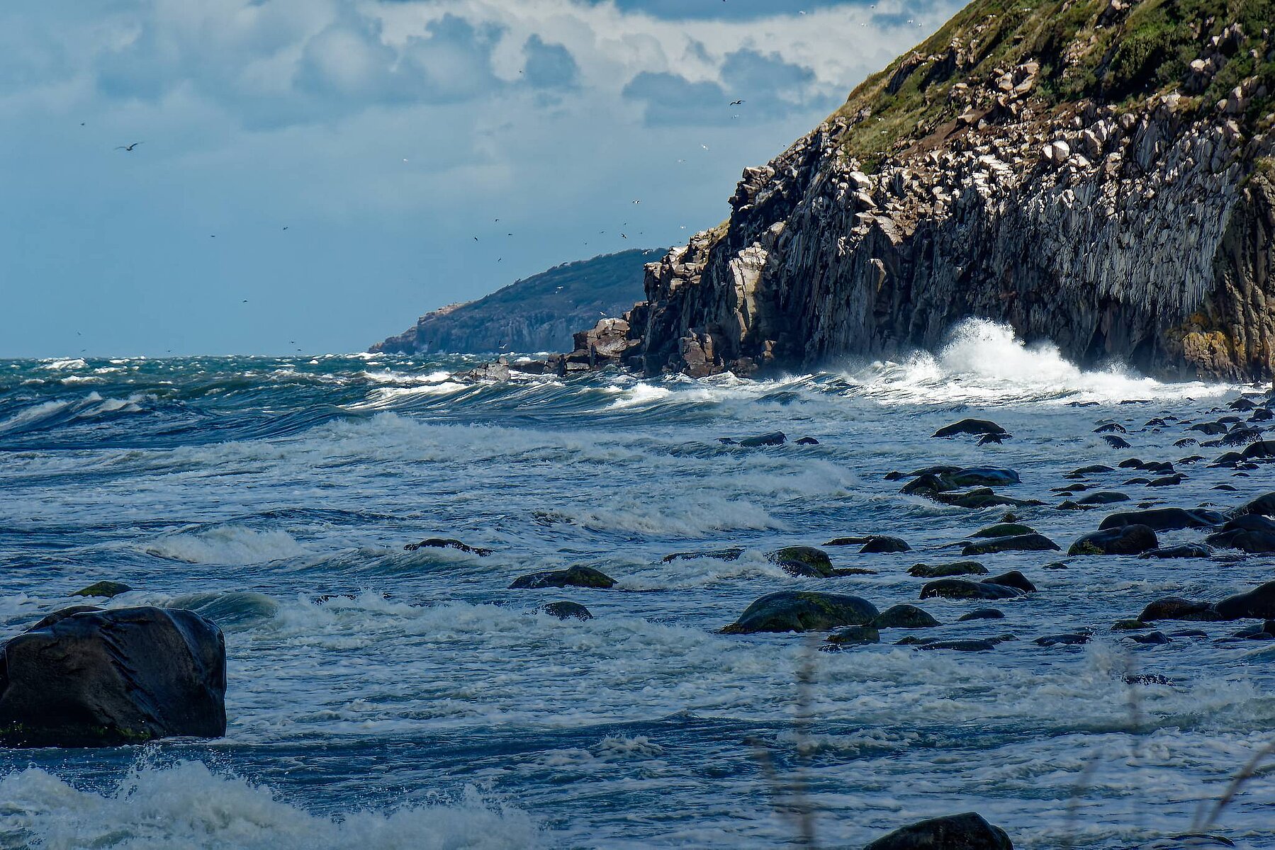 Wegen Bornholms felsiger Landmasse ist seine Küste meist Steilküste und Felsküste. Die Felsen brechen oft senkrecht ins Meer ab. Die höchsten Klippen befinden sich südlich von Hammerhus. Die Felsen an der Falkenschlucht (Falkeslugten) sind über 40 Meter hoch. Die Helligdoms-Klippen (Helligdomsklipperne) bei Tejn erreichen 22 m Höhe. Über 20 m hoch sind auch die Granitklippen von Jons Kapel bei Vang. Ausgedehnte, flach ins Meer auslaufende helle Sandstrände befinden sich nur an der Südostecke entlang der Orte Dueodde, Snogebæk und Balka.